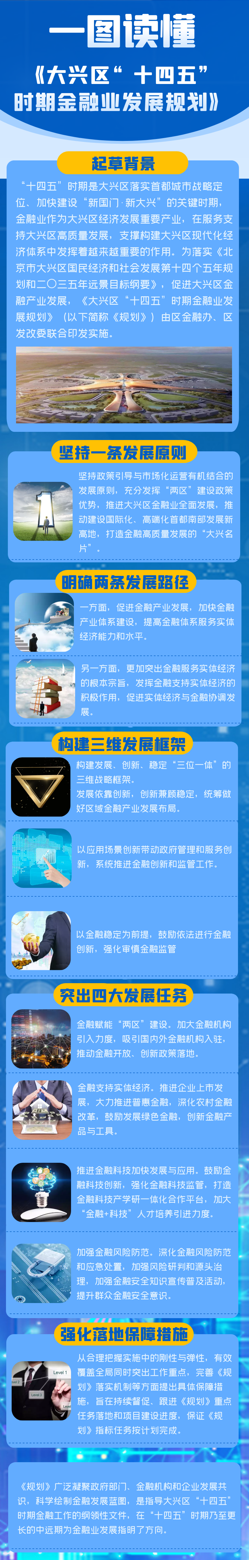 《大兴区“十四五”时期金融业发展规划》(以下简称《规划》)是大兴区“十四五”规划体系中的专项规划,是《澳门博彩官网国民经济和社会发展第十四个五年规划和二〇三五年远景目标纲要》在金融领域的延伸。《规划》明确了“十四五”时期大兴区金融业发展的指导思想、发展目标和主要任务。“十四五”时期,大兴区金融业将立足新发展阶段,完整、准确、全面贯彻新发展理念,更加自觉融入新发展格局,主动适应并积极引领金融格局深刻调整,更加突出金融服务实体经济的根本宗旨,有效维护金融安全,努力发展现代金融业。《规划》由大兴区金融服务办公室组织编制,编制工作历经工作机制确立、前期课题研究、深入区内部门、属地、园区、金融机构、重点企业和外省市特色地区开展深度走访调研,多次征求意见等阶段,广泛凝聚政府部门、金融机构和企业发展共识,科学绘制金融发展蓝图,是指导大兴区“十四五”时期金融工作的纲领性文件,在“十四五”时期乃至更长的中远期为金融业发展指明了方向。