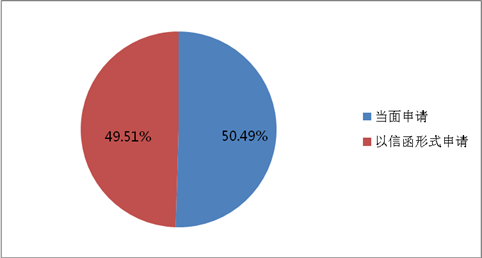 2018年全年我委共收到各类政府信息公开申请206件,申请数量较去年直线上升,其中,当面申请104件,占总数的50.49%,同上年相比,增加71件;以信函形式申请102件,占总数的49.51%,同上年相比,增加46件。